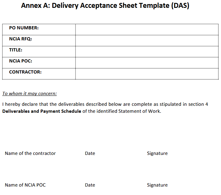 Deliverables shall be reviewed at the end of each sprint and formally accepted via a Delivery Acceptance Sheet (DAS).